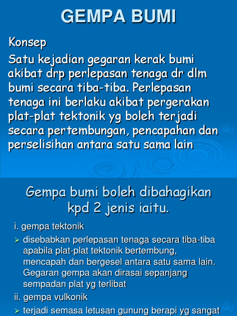 Gempa bumi berlaku apabila tenaga yang tersimpan dalam bumi biasanya di dalam bentuk geseran batu tiba-tiba terlepas. Gempa bumi yang terjadi karena. KESAN PERGERAKAN KERAK BUMI Pembentukan Banjaran Pergunungan jurang lautan mempunyai kaitan dengan kejadian gempa bumi dan letupan gunung berapi.